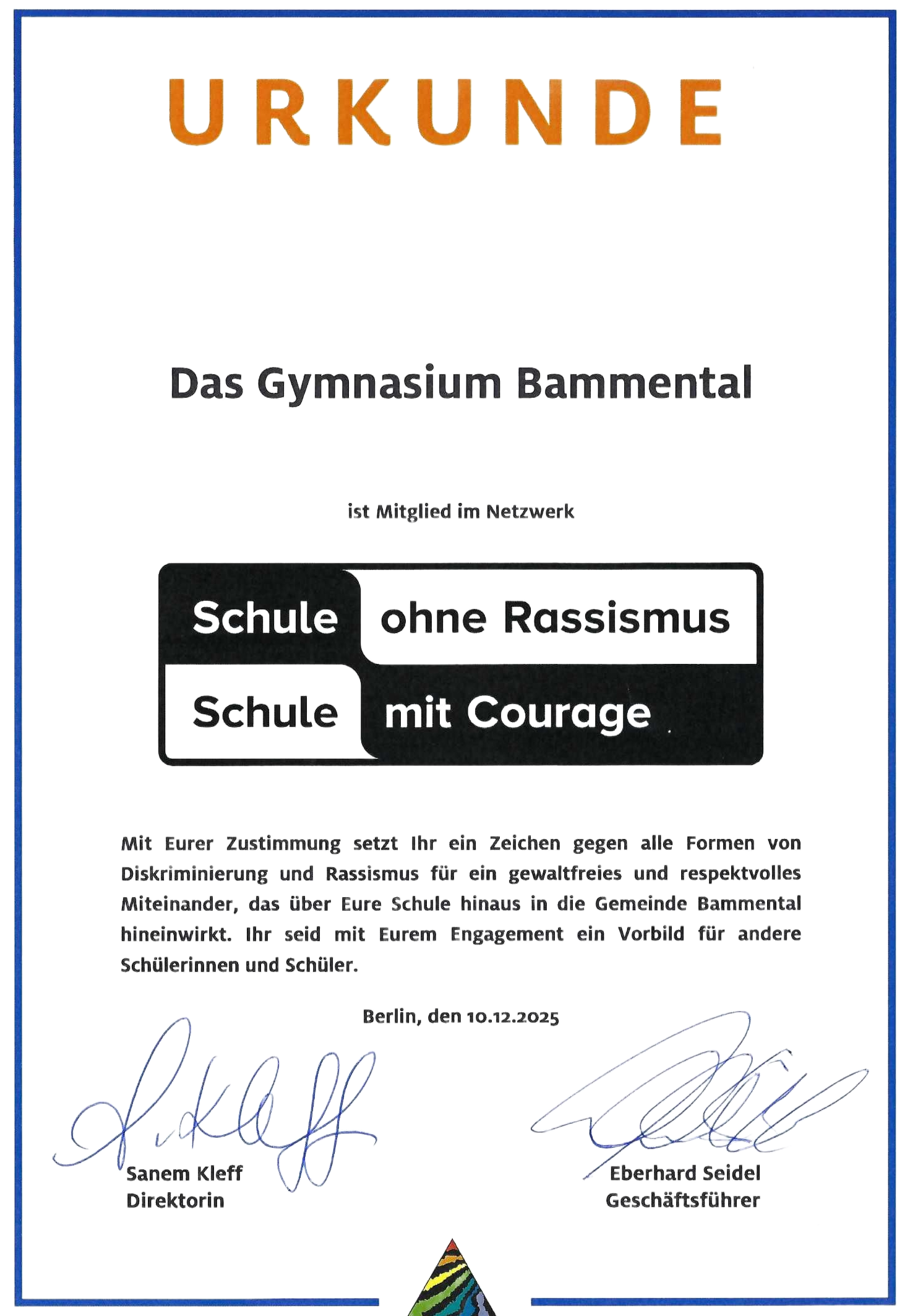 Am Mittwoch, 10. Dezember 2025, wurde das Gymnasium Bammental in das Netzwerk "Schule ohne Rassismus - Schule mit Courage" aufgenommen. Der Arbeitskreis unter Leitung von Anna Kesternich und Miriam Winterbauer hatte Programm und Feier vorbereitet. Besonders aktiv zeigten sich auch die Schülerinnen und Schüler sowie die Schulband. Sie trugen auch eigene Texte vor, die teils in Projekten mit den Paten